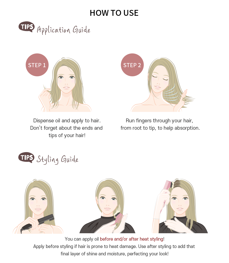 Massage a small amount of oil on the hands for an even application and apply to dry or damaged hair. Coarse hair types may need more. Avoid the root area.