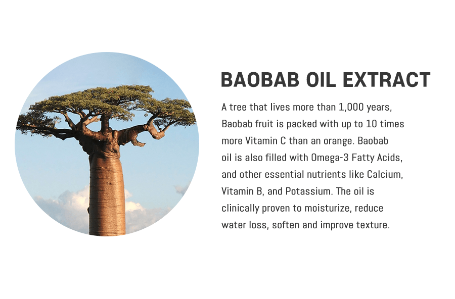 • Contains Baobab Oil with all three omega fatty acids (Omega 3, 6, 9)